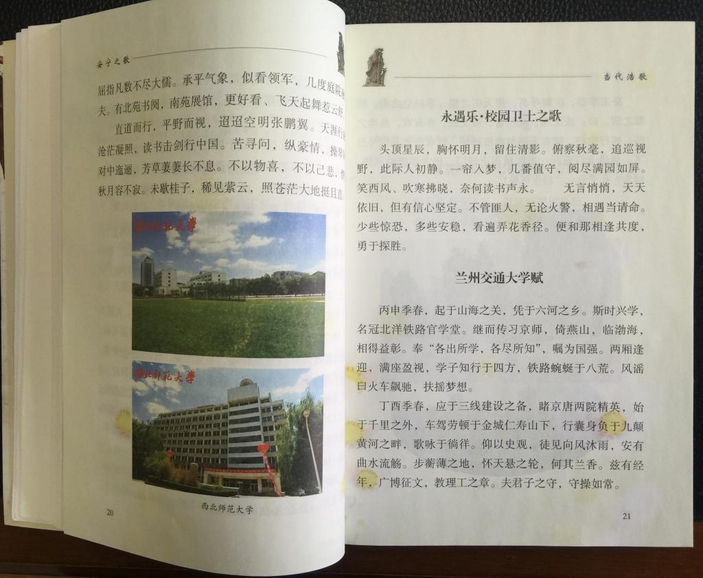 保卫处干部马同儒同志的《兰州交通大学赋》《西北师范大学赋》《念奴娇•天佑之声》《永遇乐•校园卫士之歌》等四篇作品入编。退休教师刘有录教授的《桃花岁岁笑春风(二首)》入编。另有已故退休教师陈和平教授的《参观地震博物馆有感(二首)》也入编。