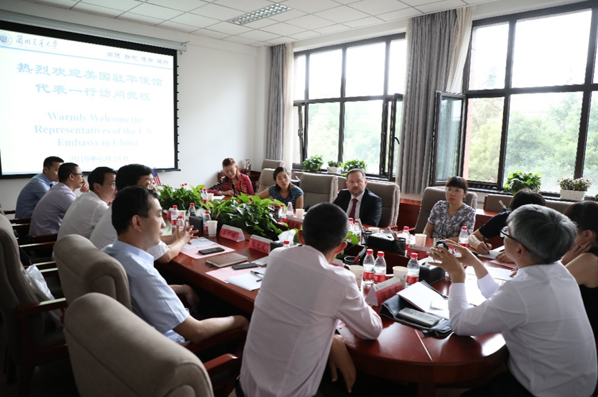 6月24日下午,美国驻华大使馆二等秘书唐俊雄先生(Adam Stevens)、二等秘书安邵荣女士(Alyce Ahn)、经济专员苏煜女士一行3人,在省外事办相关负责人的陪同下来我校访问,与我校国际交流处及轨道交通相关学院负责人和学科教授举行了座谈会。