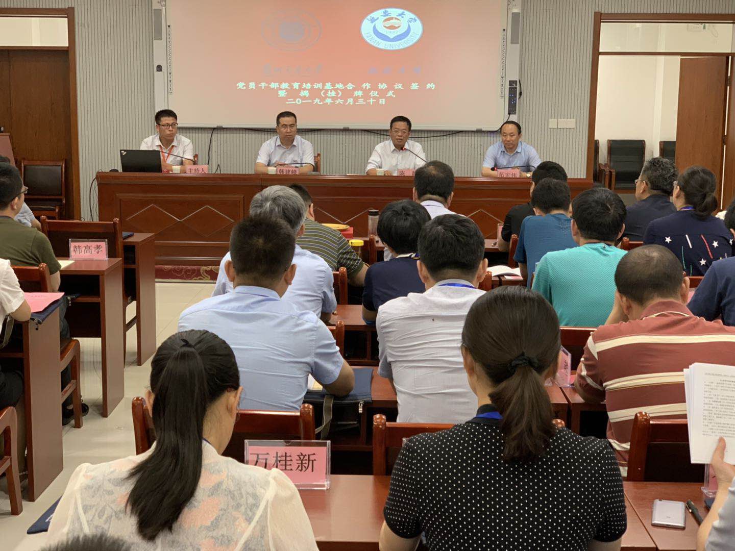 揭牌仪式上,我校与延安大学泽东干部学院签订了党员干部培训基地合作协议。根据协议,该基地依托延安大学泽东干部学院,以资源共享、优势互补、互利共赢为原则,为我校师生党员及领导干部在党性修养、理想信念、师德师风、延安精神等方面的教育培训提供支持;双方在党员干部培训内容、培训项目、现场教学点建设、教学师资、教学研究等方面开展紧密合作,全面建立良好的合作关系,共同开发相关培训课程或合作开展科学研究等。