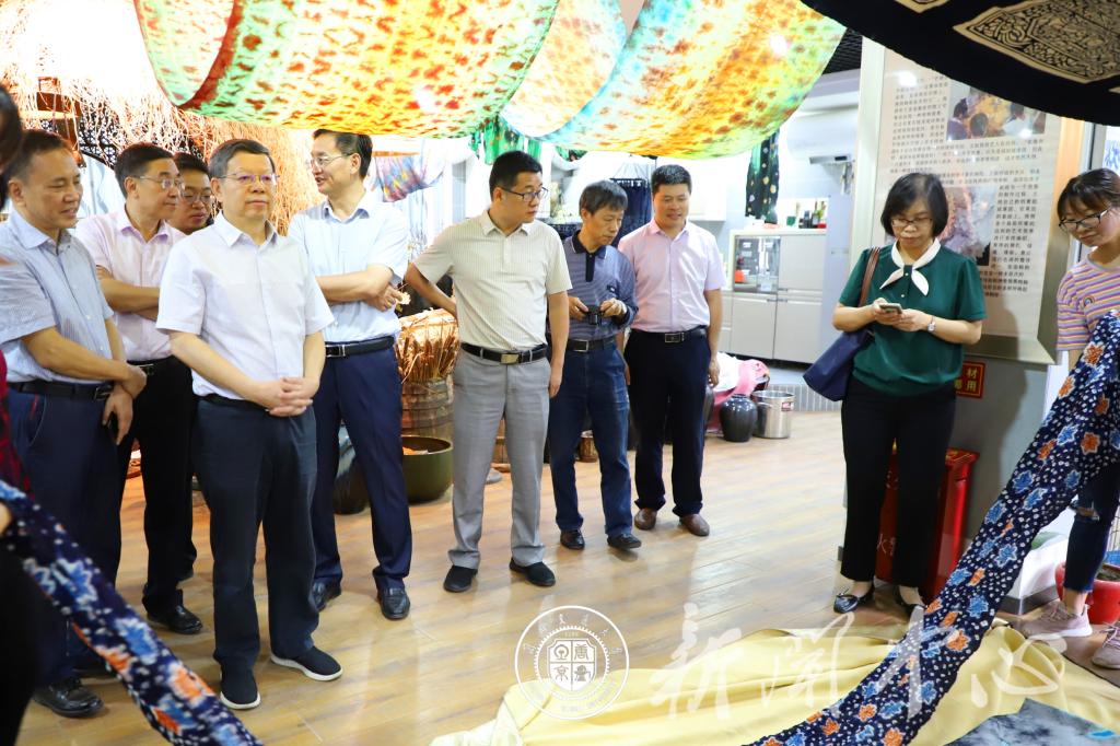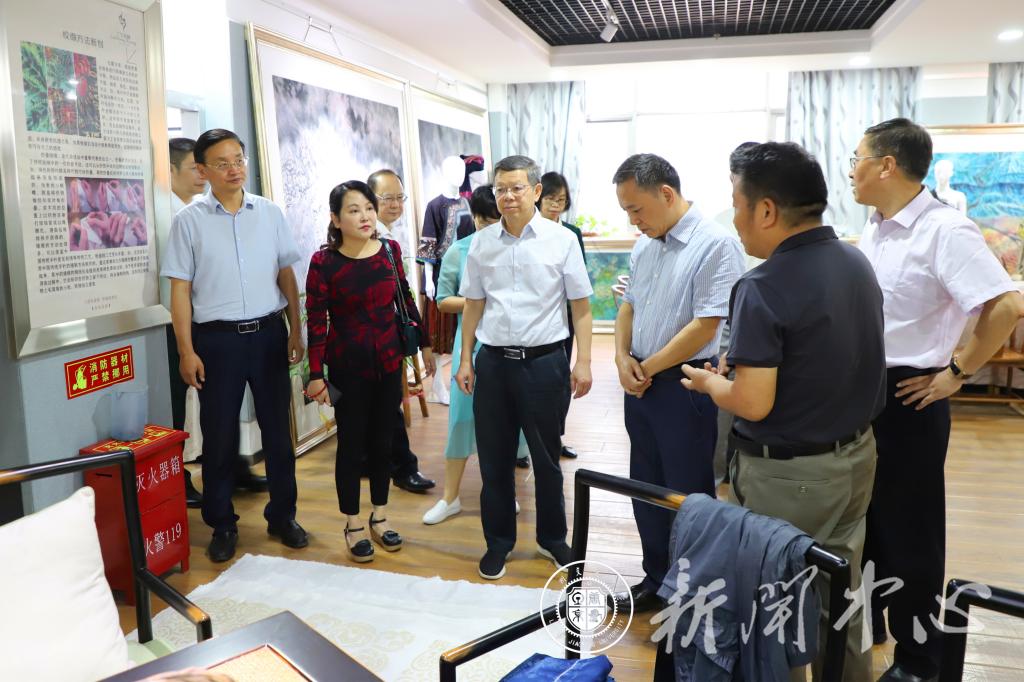 考察组一行先后对校园建设、丝绸之路染缬艺术研究所、天然药物开发研究所等进行了参观考察。在丝绸之路染缬艺术研究所,考察组观看了丝绸之路染缬宣传片,参观了植物染料染缬制作流程和染缬服装设计、染缬创意产品开发等模块。考察组成员针对传统文化保留、文化创意创新、文化企业发展等诸多问题与染撷博物馆负责人管兰生教授进行了探讨,对丝绸之路染缬学术成就和文化创意给予了高度肯定,并指出“兰生染缬”品牌是将传统文化融入现代社会的文化创意亮点,具有明显的时代特征和地域特征。