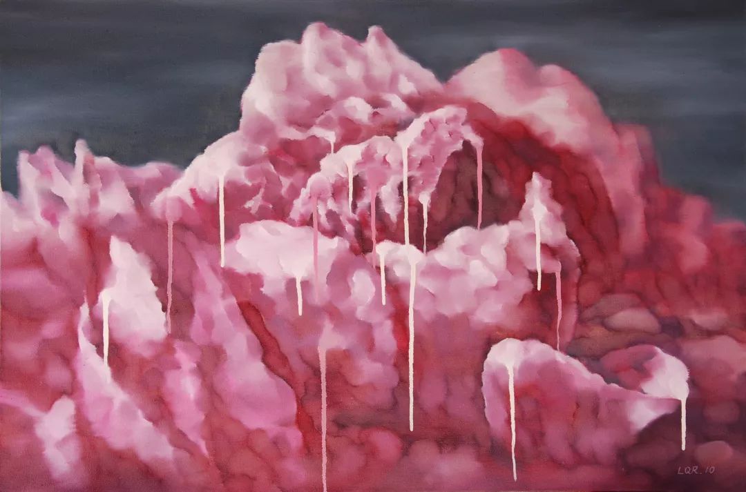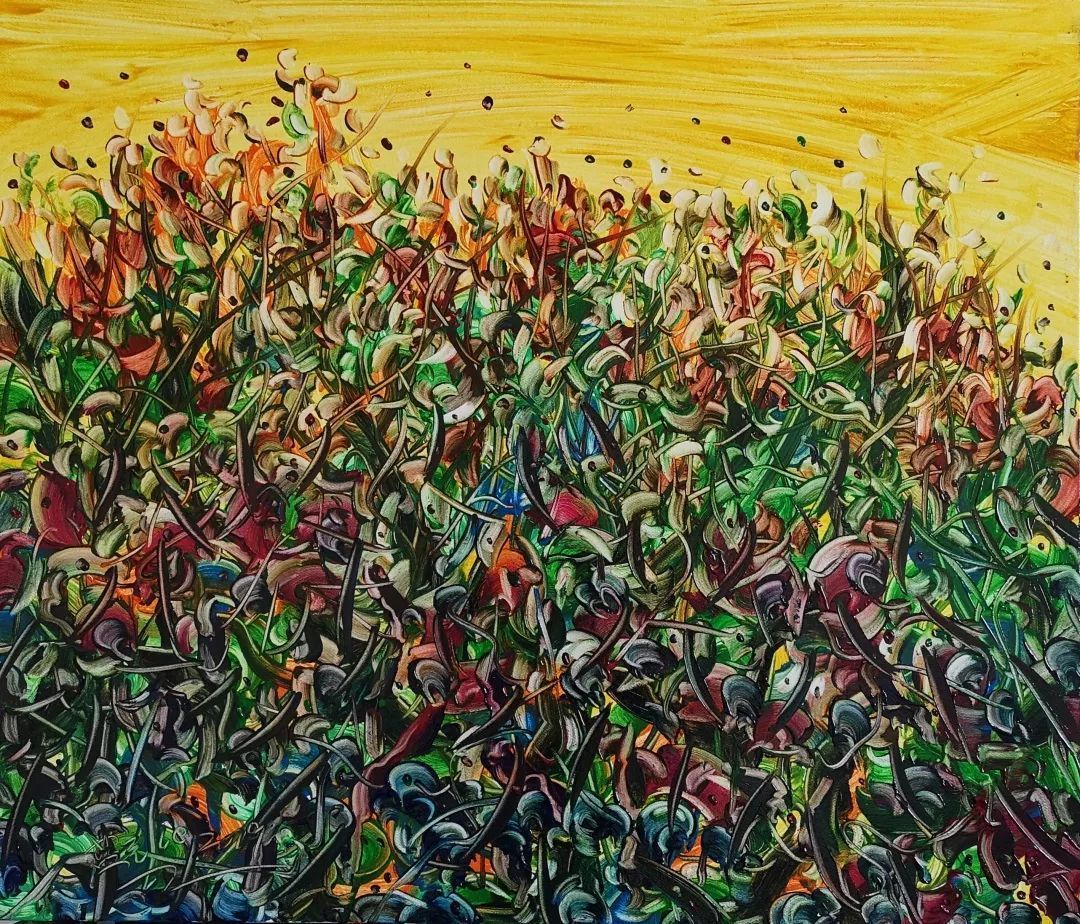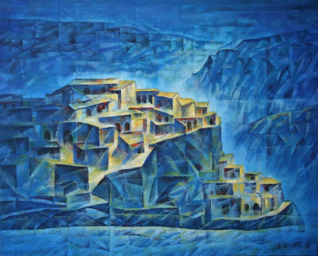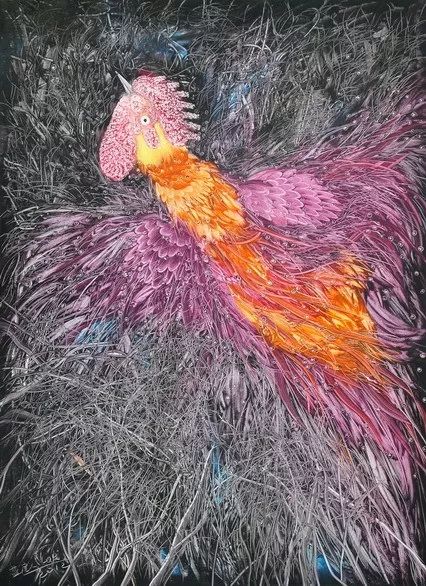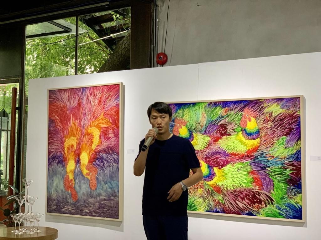 走进展厅首先映入眼帘的是他以重庆为题材的作品。这批画作有着中国传统山水写意画的景观骨架,让人一眼就看出是山城重庆。在表现手法上,更多使用西方印象派油画的色彩切割手法,使得整个画面显得朦胧,充满着一种欲说还休的诗意。重庆的山与水、城市,混合着蓝充强烈的感情,抽象地呈现出来。在“花花世界”系列中,可以看到其作品《绽放》的桃花异常绚烂,绚烂地色彩要滴落下来,透着些许孤寂。之后的“涅槃”系列则画风大变,其主意象是公鸡,视觉冲击力强烈汹涌,这一系列可以看作是作者对传统中国写意画的一种致敬。公鸡作为传统花鸟的一个重要题材,成为古今画家钟爱的主题。还有一层更深的意义是,他对位于兰州的敦煌的一种致敬。“涅槃系列”画面中色彩交流、纠缠、堆叠,跟敦煌的壁画与丝绸之路的精神内核不谋而合。