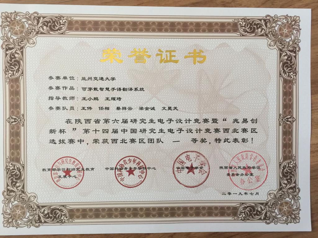 参赛选手通过作品展示和分组答辩等评审环节同台竞技,经过为期两天的激烈角逐,由我校选派的“可穿戴智慧手语翻译系统”荣获团体一等奖,“多功能远程操控机器人的研发与产业化”、“改进的低成本手势控制四旋翼无人机”、“便携式无线电收发系统”分别荣获团体三等奖。