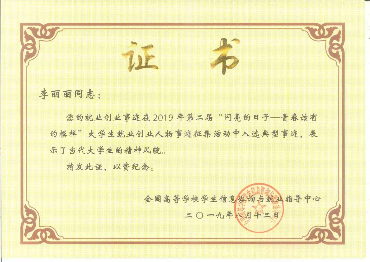 为贯彻2019届全国普通高校毕业生就业创业工作网络视频会议精神,书写中国高等教育“奋进之笔”,响应习近平总书记和李克强总理鼓励大学生基层就业和创新创业的号召,加强高校毕业生就业创业宣传,全国高等学校学生信息咨询与就业指导中心组织展开了第二届“闪亮的日子——青春该有的模样”大学生就业创业人物事迹征集活动。