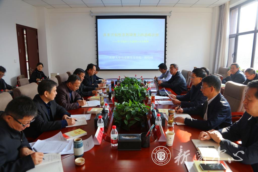 会议邀请天津大学马克思主义学院院长颜晓峰教授作了题为《具有开创性里程碑意义的战略决策——学习党的十九届四中全会精神》的专题报告。报告围绕站在历史交汇点的战略眼光和历史担当、具有多方面显著优势的中国特色社会主义制度和国家治理体系、在坚持和完善中国特色社会主义制度的实践中推进国家治理体系和治理能力现代化三个方面,对党的十九届四中全会精神进行了系统阐述和深入解读。报告内容丰富,高屋建瓴,对深入理解全会精神,准确把握全会《决定》的重大意义具有积极促进作用。