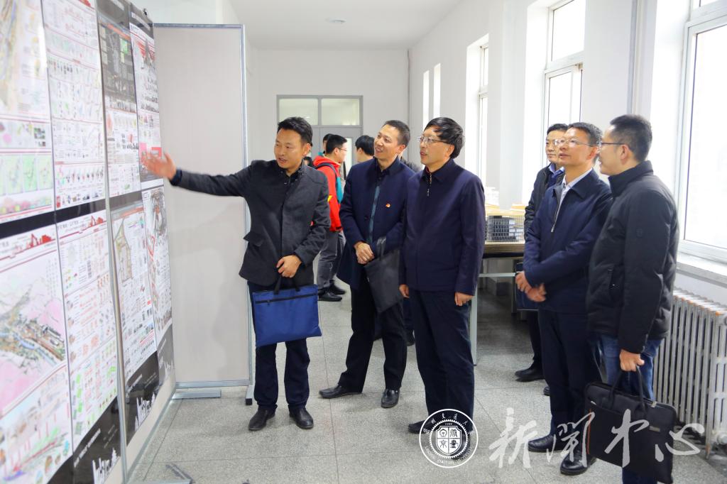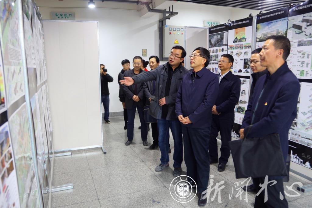 杨子江一行首先参观了竞赛获奖区,听取了规划系主任杜森和建筑系主任王昱鸥老师就学科竞赛和获奖作品的详细介绍。随后,一行人员参观了优秀毕业设计展区和课程设计作业展区,当看到为我校精准扶贫结对帮扶的康乐县完成的乡村振兴规划作品时,杨子江详细询问了规划实施及我院教师发挥专业特长开展社会服务的情况,鼓励我院教师多参与设计实践、积极考取国家注册执业资格证,提升工程实践能力,提高培养工程型人才的能力。