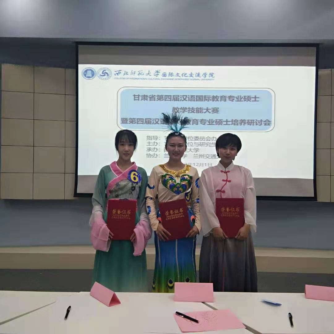12月1日,甘肃省第四届汉语国际教育专业硕士教学技能大赛在西北师大举办,我校文学与国际汉学院选派的三位选手表现出色,荣获佳绩。经过“自我介绍”、“教学技能大赛”、“中华才艺展示”三个环节的展示,评委现场亮分,总分合计,最终,我校2019级汉语国际教育专业硕士生任亚玲、王子千包揽国内组比赛一等奖,张涵池获得国内组三等奖。