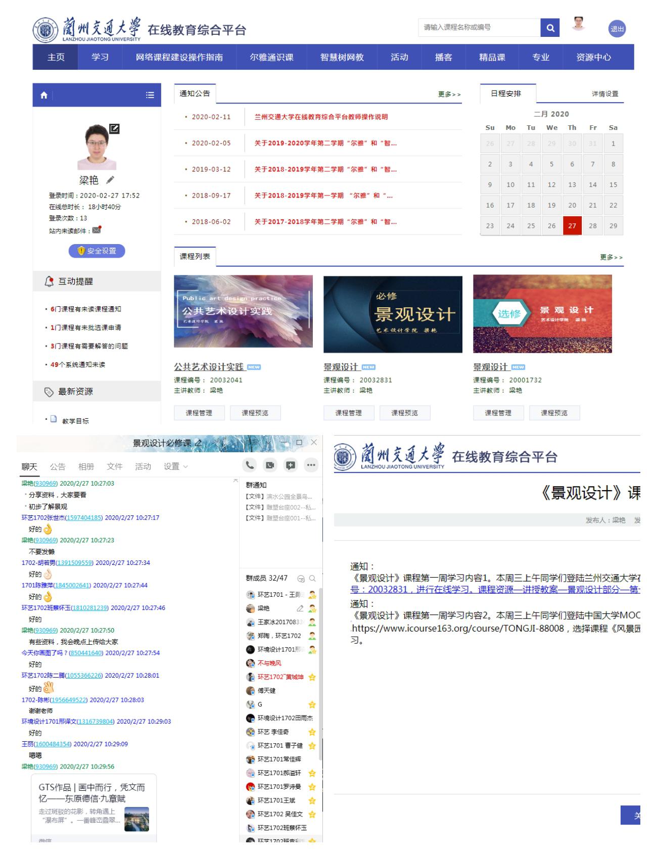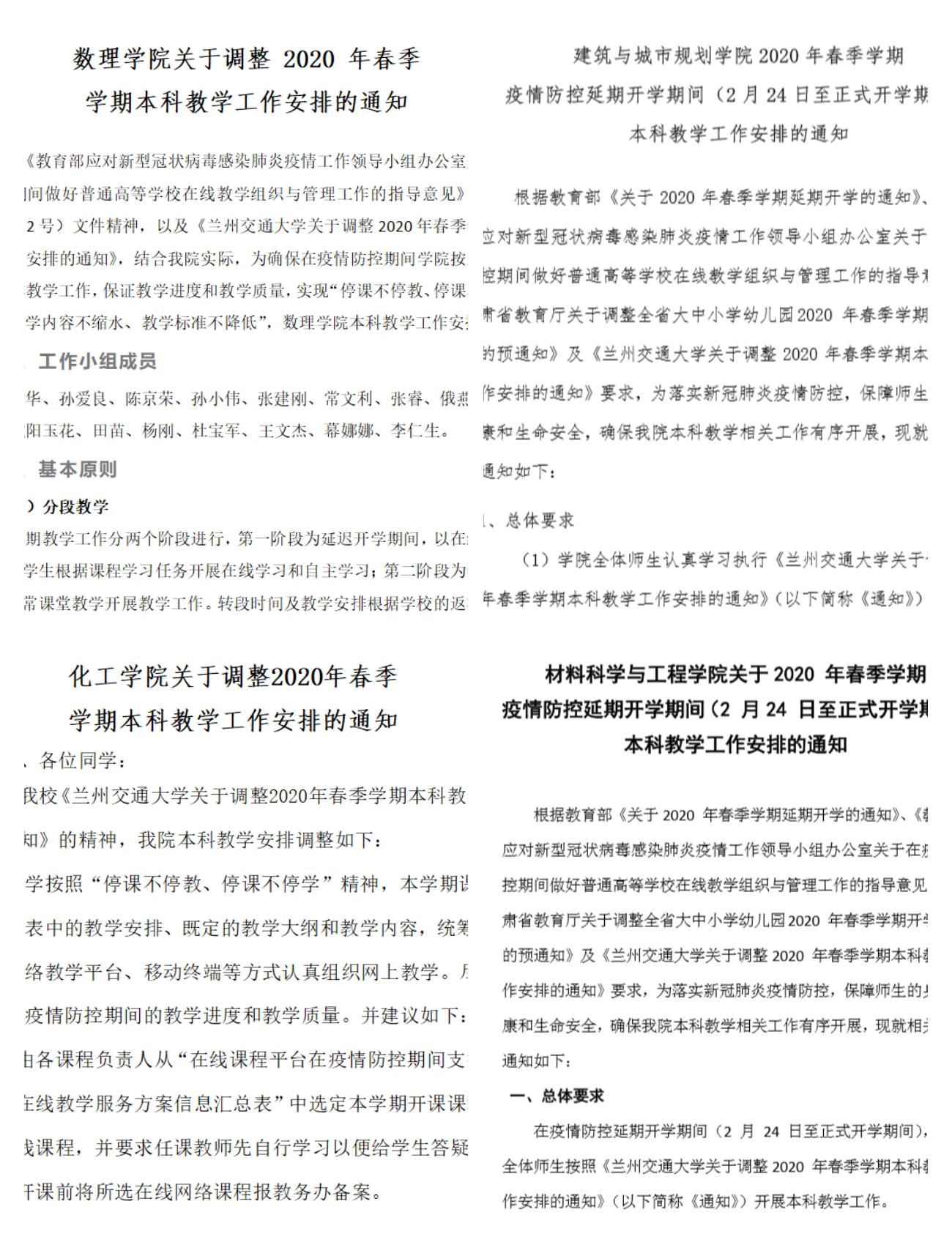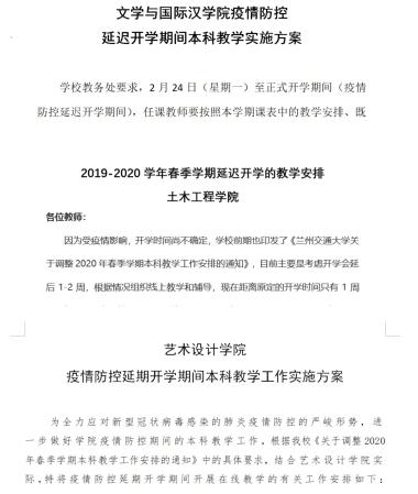 为保障疫情防控期间本科教学工作的顺利开展,根据教育部应对新型冠状病毒感染肺炎疫情工作领导小组办公室相关要求,我校结合实际及时发布了《兰州交通大学关于调整 2020 年春季学期本科教学工作安排的通知》(以下简称《工作安排》),就网络在线教学等工作做了周密部署。自2月24日开课以来,教学秩序良好,达到了预期效果。