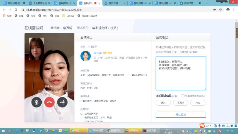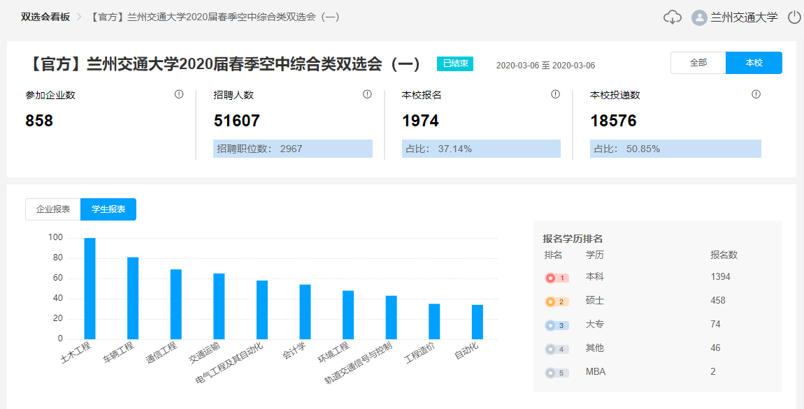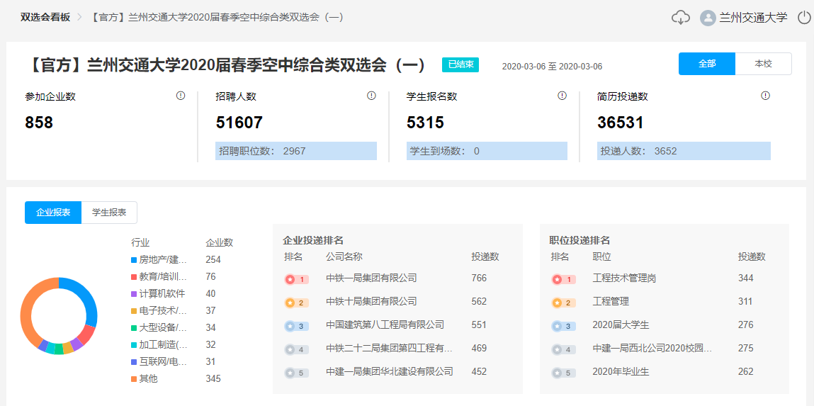 据统计,本次空中双选会共有858家省内外各界用人单位报名参加,涉及轨道交通、装备制造、能源化工、IT信息、施工建筑等众多行业,其中国有企业、中国五百强企业、行业百强企业、上市公司超过七成,企业需求专业涵盖了学校现有学科门类及专业,招聘职位达2967个,招聘需求数量51607人,参会企业规模、质量及需求人数均创下学校双选会举办之最。本次空中双选会采用毕业生在线提前向意向单位投递简历,企业在线审核通过后发起网上视频面试、互动交流的方式招聘,实现了毕业生“足不出户”即可“隔空”找工作的目标。本次双选会共吸引了来自省内外高校毕业生5315人,其中本校毕业生1974人,企业收到毕业生简历36531份,其中本校学生投递简历18576份,截至当天下午5:00,企业累计面试毕业生3298人,初步达成就业意向1856人,其中本校学生832人。双选会结束后,企业将对通过简历审核但未面试的毕业生继续跟踪,发起面试邀约,完成后续面试、签约等后续工作。