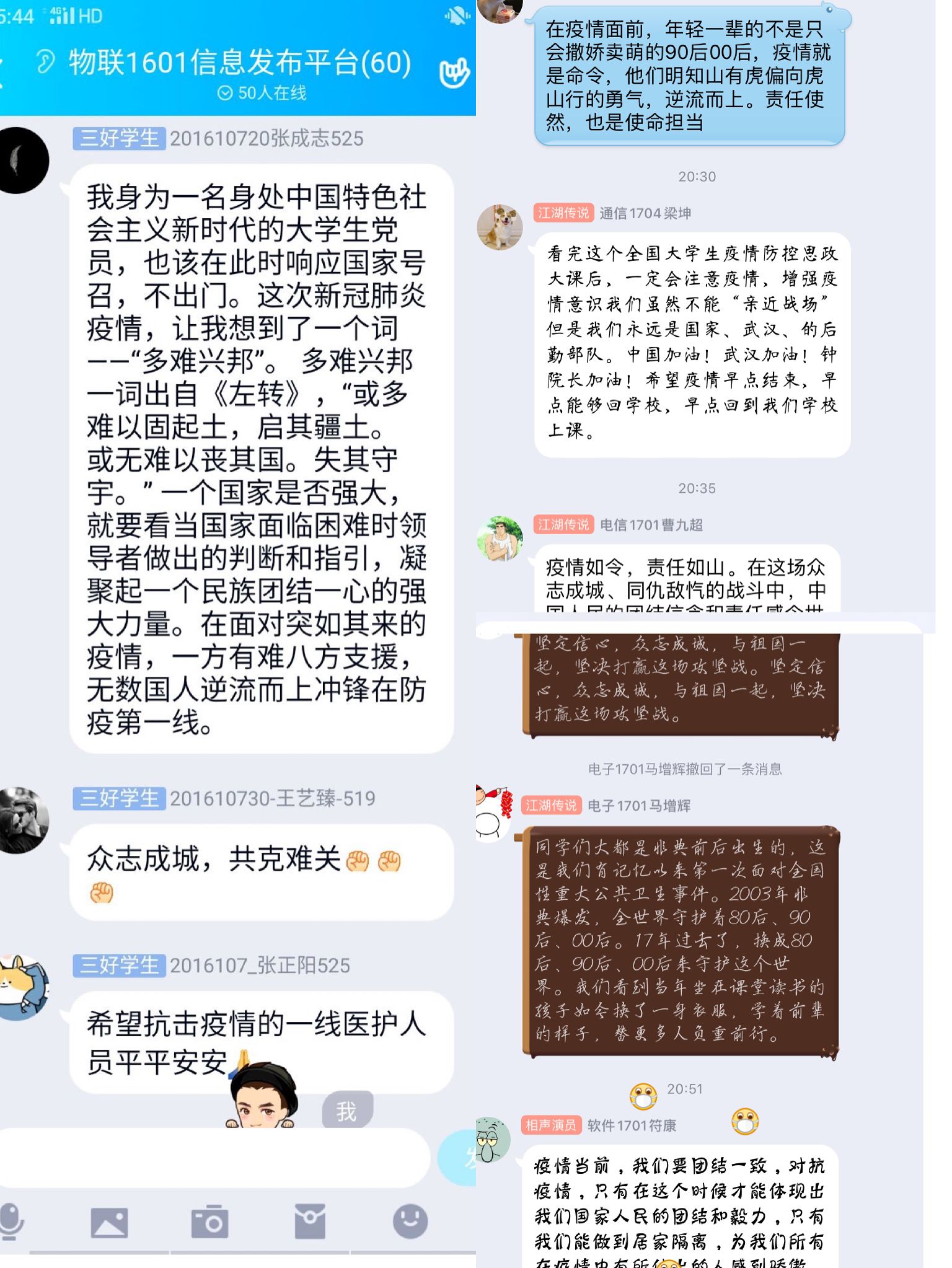 新能源1701班戴子闻表示:梦醒之时,方知波涛之中,谁为英雄。这次的新冠疫情,从某种意义上,是对我国社会主义制度和国民凝聚力的一次大考。疫情爆发,我国当机立断采取了紧急政策,全民隔离,学校休学,实体业歇业,火神山雷神山医院在几天之内拔地而起,彰显了我国在危机关头临危不惧的处理态度和强硬手段。身为中国人,我们一定要自信,要挺起身来,相信我们一定能够安然地渡过这次浩劫。而作为中国青年,我们要像鲁迅先生所说的那样,摆脱冷气,只是向上走,不必听自暴自弃者流的话。能做事的做事,能发声的发声。有一分热,发一分光。就如萤火一般,可以在黑暗里发一点光,不必等候炬火!