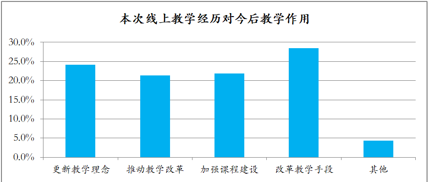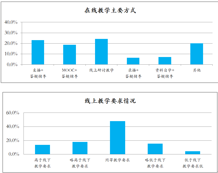教师线上教学质量问卷调查结果显示,我校教师采用灵活多样的在线教学形式,以直播+答疑辅导、MOOC+答疑辅导、线上研讨等方式为主;80%以上教师的线上教学要求不低于线下教学要求;本次线上教学经历对今后更新教学理念、改革教学手段、加强课程建设起到积极的推动作用。
