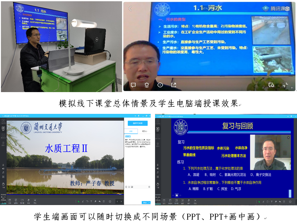 严子春教授模拟线下课堂情景的线上直播教学。考虑到学生课堂学习的视野习惯于黑板,严子春教授在《水质工程学》线上授课中使用了一台55寸液晶屏电视模拟黑板场景,并用两台笔记本电脑将课件和教师同时切入画面,实现液晶屏课件与教师“同框”,构建了基于腾讯课堂的直播教学系统。通过教师的表情和肢体语言辅助吸引学生学习的注意力,避免静态课件画面使学生走神。同时还可以随时切换成“PPT+画中画”的方式,避免学生的视觉疲劳。不仅如此,他还通过腾讯课堂软件“签到”上课时长监控、“答题卡”在线答题、“讨论区”文字发言、“举手”问题抢答等功能进一步丰富了在线教学,结合线下自建网络教学资源的辅助学习,学生对严子春教授的授课效果十分满意,评价较高。