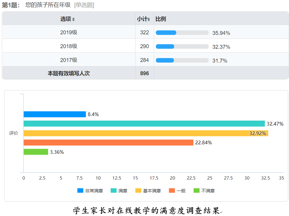 二是采取“任课教师+家长”监控学生的学习效果。通过问卷、访谈、在线听课等方式了解教师对学生所授课程效果的评价,及时掌握学生出勤率、作业完成率、学习效果等信息;此外,还通过问卷方式对家长进行调研,及时了解学生在家精神状态、学习效果以及家长对在线授课的了解和满意情况,学院通过对低年级896名学生家长的调研结果来看,线上授课满意度与学生调研数据整体吻合。通过上述“2”个方面的监控,实现了家、校之间对学生的共同监督和指导。