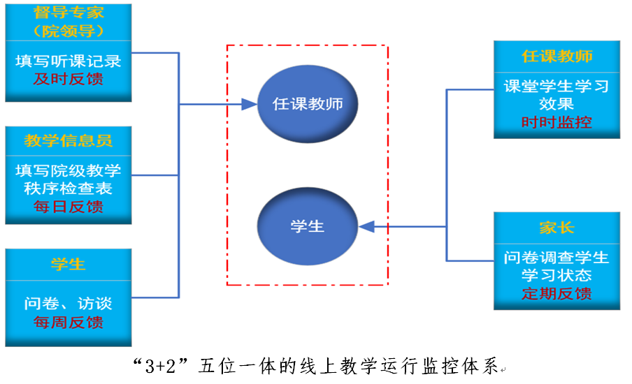 疫情期间线上授课是按照教育部“停课不停学、停课不停教”总体部署来开展的,许多教师都是第一次开展线上教学工作(问卷显示有53.97%的教师没有线上教学的经历),线上教学质量保障成为各教学单位的重中之重。环境学院对此做了周密部署,采取“3+2”五位一体的线上教学运行监控体系,全面保障线上授课质量和效果。