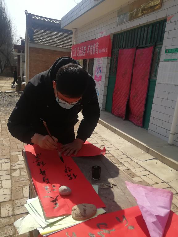 为了进一步扩大宣传效果,杜绝人员集中,刘晓阳买来了红纸,用毛笔书写了近100张标语,贴在了人员流动性大、显眼的地方,并与村委会人员把自己起草的《告全体村民通知书》录制成音频循环广播。除此之外,他还和村干部一起对村中人员流动性大的交通干道、超市、广场等地方喷洒消毒剂。村委会支书说:“刘晓阳同学积极参与到村里的疫情防控工作中,配合村里完成了许多工作,为村里的疫情防控做出了突出的成绩,值得肯定”。