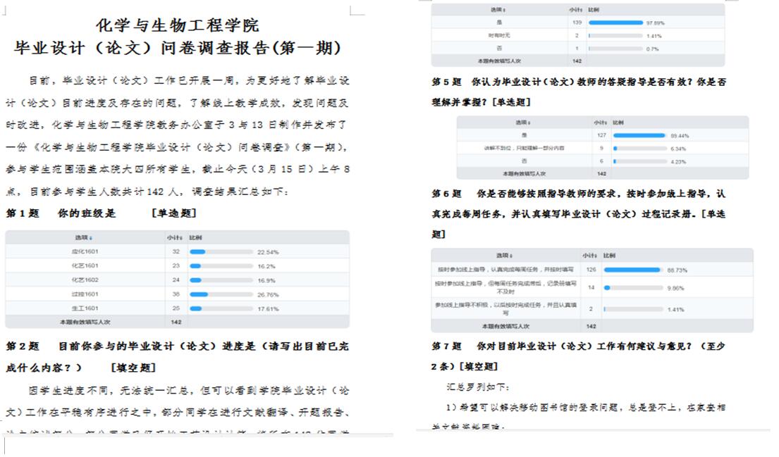 三是开展毕业设计(论文)线上教学问卷调查,督促毕业设计进度。学院针对毕业设计(论文)工作开展《化工学院本科毕业设计(论文)线上教学问卷调查》,涵盖全体毕业生,从答疑指导、选题、进度等方面开展调研,形成调查报告《化学与生物工程学院毕业设计(论文)问卷调查报告(第一期)》,及时掌握学生在毕业设计(论文)过程中的问题,意见和建议,并反馈给指导教师,及时做出改进。