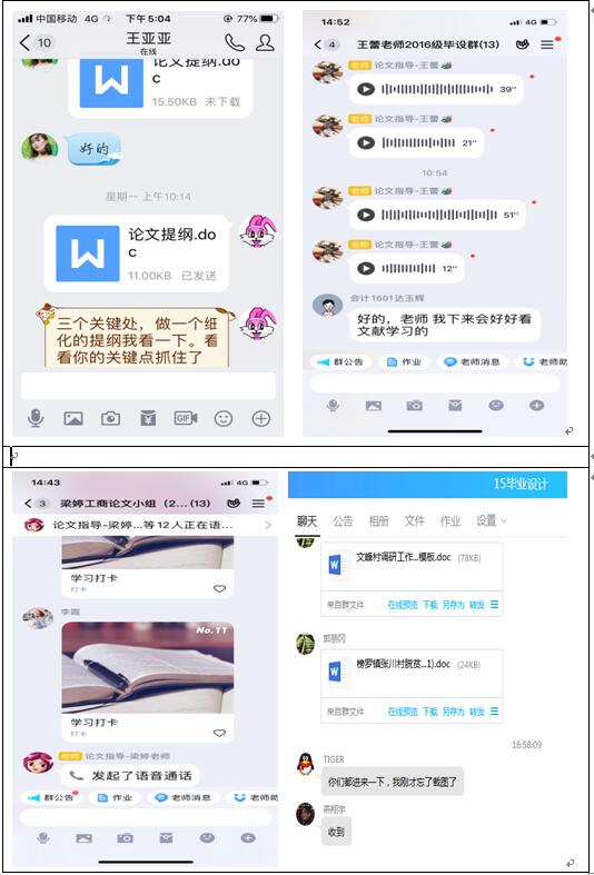 本科毕业设计(论文)线上答疑指导工作有序推进。3月9日~3月13日,教务处组织工作人员通过加入指导教师QQ群、微信群等方式,对学校本学期毕业设计(论文)在线指导答疑情况进行了抽查,共检查16个学院557名指导教师。除29个群由于设置限制未能进入检查外,其他528名指导教师都能按照上报的毕业设计(论文)答疑时间,按时进行一对多或随时进行一对一组织线上答疑,指导学生并掌握和检查学生毕业设计(论文)工作进度,督促学生认真填写毕业设计(论文)过程记录册,确保学生保质保量按期完成毕业设计(论文)。个别老师因带的毕业设计(论文)学生人数较少或者因为涉及隐私,需要单独开展答疑指导工作,并提供了按时答疑相关截图。各学院比较重视线上答疑指导督导检查工作,其中自动化学院利用学院自行开发的毕业设计(论文)三表管理系统完成任务书、开题报告、自查表等过程性资料的填报、审核、修改、生成等工作;环境学院通过“督导—指导教师”配对联系群进行监督检查,及时督促老师按时答疑,保证毕业设计(论文)工作有序进行;土木学院对于往届重修毕业设计(论文)学生,学院教务办建立专门联络群,加强联系与管理,并督促每位学生按规定要求按时参加指导教师的毕业设计(论文)答疑指导工作。