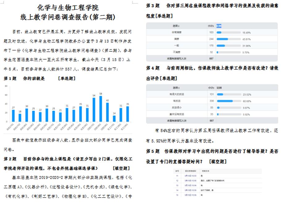 二是学院继续自拟问卷,针对课程进行线上教学调研工作。学院主动调研前三周线上教学师生情况,为更好了解学生学习效果,发现问题及时改进,开展了《化工学院线上教学问卷调查(第二期)》,涵盖全体学生,从调研课程、学习方式、师生互评、改进方式等方面开展调查,形成《化学与生物工程学院线上教学问卷调查报告(第二期)》,及时掌握了学生对线上教学的问题,意见和建议,并反馈给任课教师,及时作出改进。