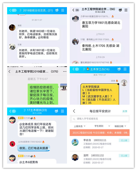 疫情初期,学院就制定了《土木工程学院疫情防控学生工作方案》,确立了“重点关注、全面关注、长期关注、保障安全”的防控原则,建立了“学生-班干部-学生家长-班主任-辅导员-学院”六级联防联控机制,层层压实防控责任,实现了防控全覆盖,不留工作空白点。重点关注,迅速排查湖北籍(不含武汉)、武汉籍、放假期间有湖北地区接触史的学生以及假期外出和滞留外地的学生,单独建立QQ群,专人负责,分类管理;全面关注,通过多种渠道对湖北地区以外的学生及时传达防控工作要求,做到了人人知情,严格遵照执行;长期关注,全体学工人员和学生干部树立“全院一盘棋”的思想,适时跟踪,掌握动态,齐心协力,共克时艰,坚持不懈地打赢疫情防控的阻击战;压实责任,明确了班主任、辅导员是学生疫情防控直接负责人,全员在岗,全天在线,严防死守,严禁学生提前返校;精准统计,对各类工作群分别制定了报送固定格式和报送时间要求,在全校本科生中率先实行了今日校园学生报平安,对重点学生实行QQ群和今日校园报平安两条线同时报送,班干部、班主任负责日报辅导员,辅导员每日上报学院,学院专人负责每日汇总上报学校,保证了无漏报、零死角。