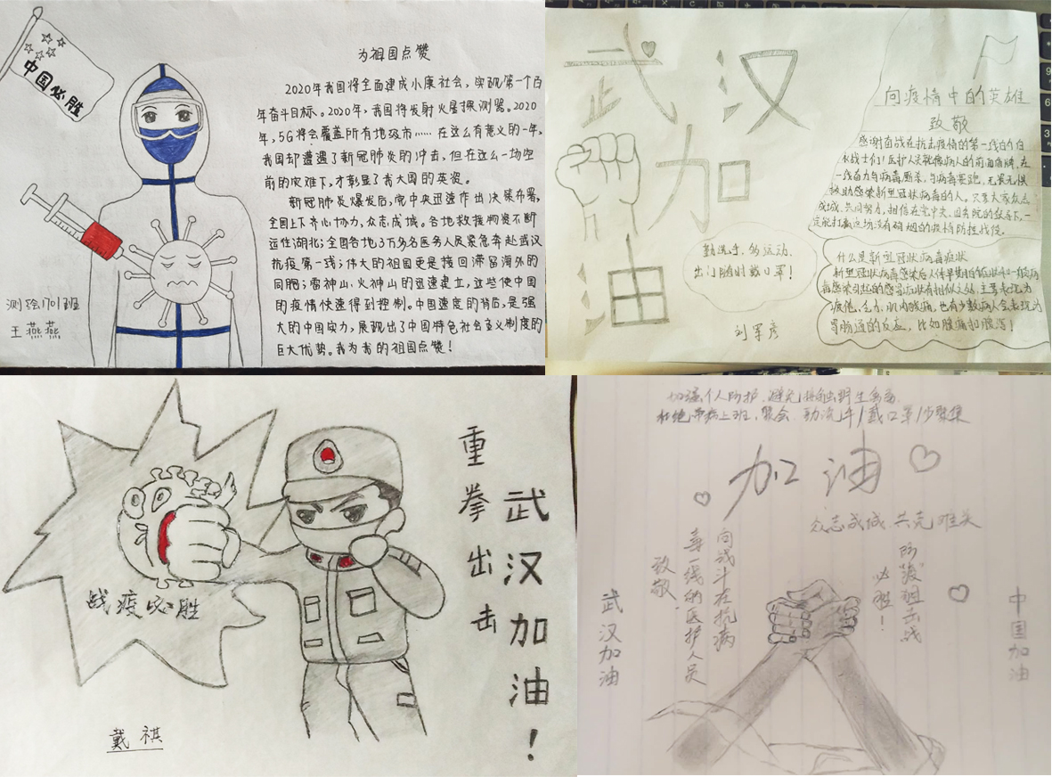 学生党支部组织党员录制“武汉加油,中国加油”创意宣传短视频、绘制海报和绘画等作品,用生动的语言和行动,向同学们传递同舟共济抗疫情的正能量,展示高校学生居家防疫的“正确姿势”,以别样的方式表达当代大学生党员的精神风貌,“坚定信心、同舟共济”,为早日战胜新型冠状病毒感染的肺炎疫情贡献自己的力量。
