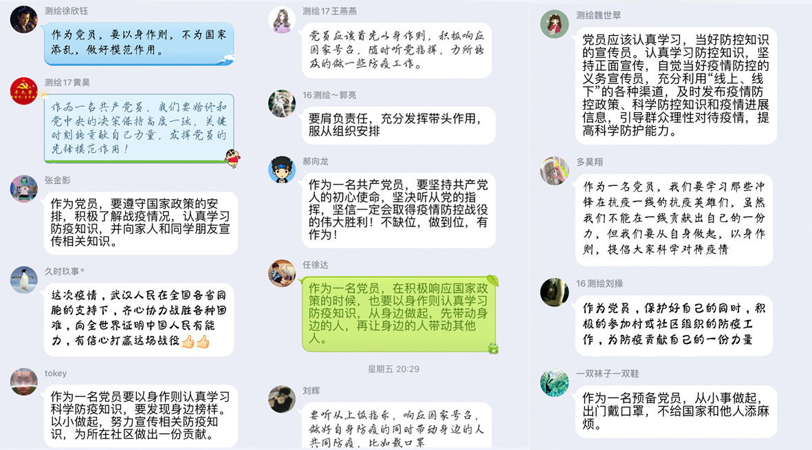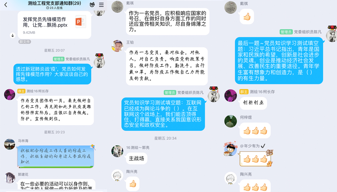 此次线上主题党日活动,各支部开展了“防疫知识抢答”、“抗击新冠疫情,讲述榜样故事”、“抗疫有我,爱国力行”、“围绕战疫抗疫,打赢健康保卫战”等主题党日活动。学生党员热情参与、收获颇丰,学习取得了良好效果。
