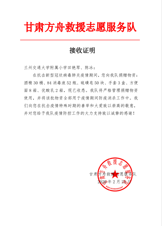 在抗击疫情期间,附小党员不但能立足岗位,做好学生的学习指导工作,而且能积极参加志愿活动并为社区和救援中心捐赠物资,主动承担社会责任。自疫情发生后,陈冰、田艳琴两位老师自愿在交大社区、甘肃蓝天救援中心从事“抗疫”志愿工作,陈冰因为超长时间参加一线“抗疫”工作,被甘肃蓝天救援中心授予“优秀队员”荣誉称号。两位老师将一月份和二月份的工资全部用来支持“抗疫”公益工作。她们一起多次为交大社区、兰飞小区、甘肃方舟救援中心筹集捐赠酒精、口罩和一次性医用手套等紧缺物品,为抗疫社区志愿者捐助方便面酸奶等生活用品。从微信朋友圈获悉秦安县山区叶堡镇王沟小学开学之际,急缺“防疫”物资,两位老师给学校每一位孩子购买、捐赠了口罩、酒精、运动服、毛衣。中考在即,临夏福利院的孩子急需英语辅导老师,求助社会,两位老师积极和外语学院老师取得联系,对福利院的孩子进行线上辅导,同时还和甘肃蓝天救援队一起捐钱捐书,为临夏福利院的孩子解决燃眉之急。