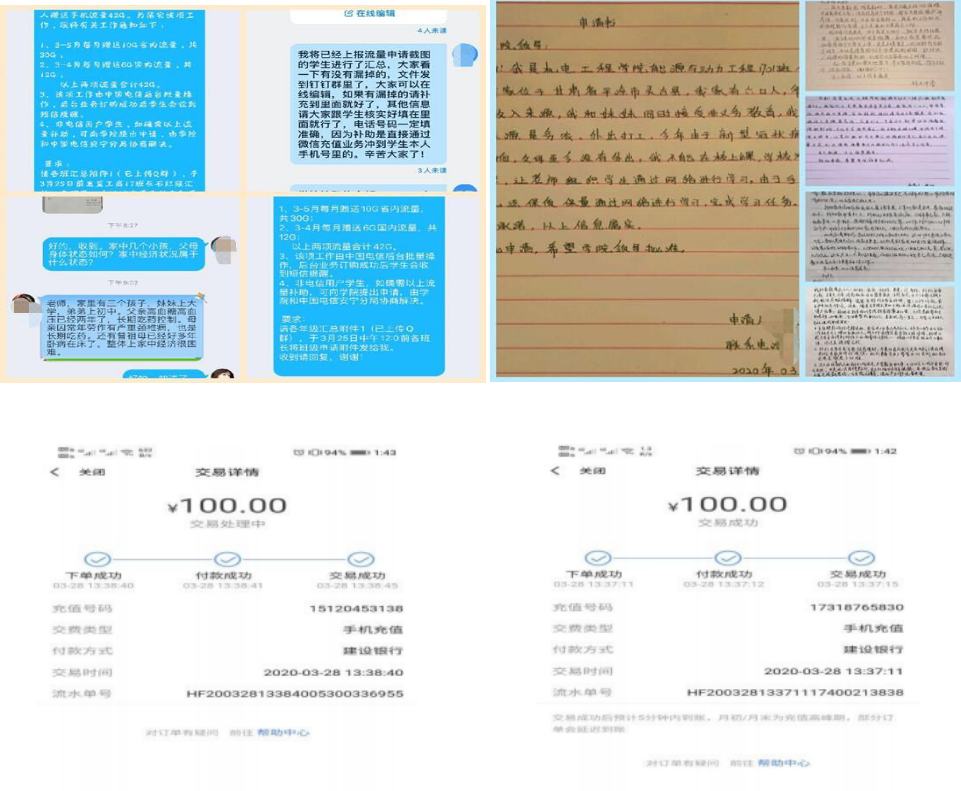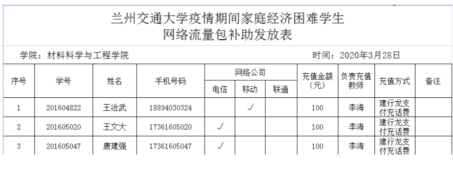 根据学校教学工作安排,学校于2月24日开始进行线上教学。为确保家庭经济困难学生获得更好的线上教学服务,减轻学生线上学习的网络资费压力,学校及时摸排学生情况,全面了解家庭经济困难学生的学习、生活状况,截至目前,学校共为1086名家庭经济困难学生提供了100元(3-4月)网络流量包补助,共计金额10.86万元。