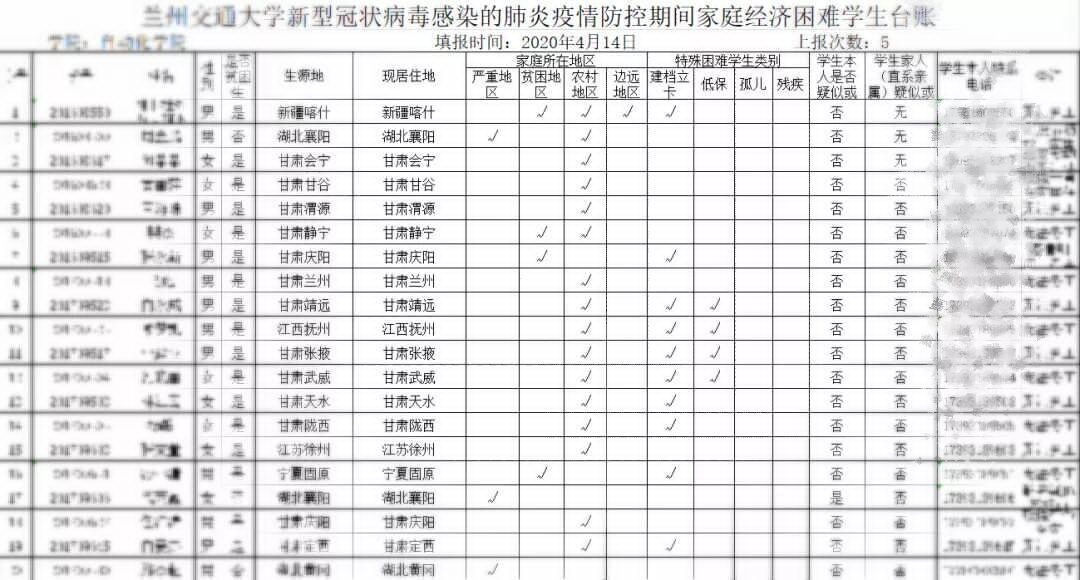 为密切关注疫情防控期间家庭经济困难学生的实际情况,及时了解受疫情影响的学生身体和生活情况,要求各学院(部)要采取有效措施,组织辅导员、班主任系统排查受疫情影响的家庭经济困难学生并逐一登记。截止4月14日根据我校各学院(部)排查,共计2059人,其中建档立卡户和低保户1234人,孤儿和残疾人数49人,湖北籍家庭经济困难学生54人。在排查中切实做到了对感染新冠病毒学生、疑似感染学生、家庭直系亲属感染学生、隔离观察学生、受到疫情影响主要劳动能力不能外出或延迟外出打工的家庭经济困难学生情况的精准掌握。