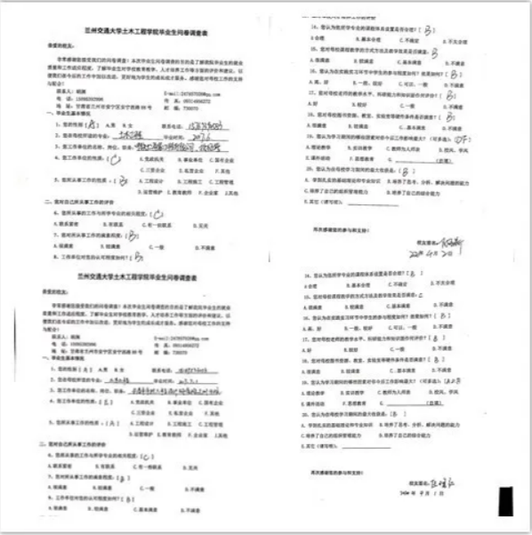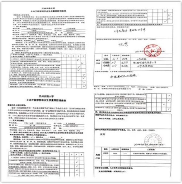 学生工作办公室利用网络、电话等途径,联系用人单位和毕业生,在QQ群发布相关通知和问卷,用人单位通过摸排调查整理,对学院毕业生进行综合评价;毕业生通过下载打印填写问卷,扫描或拍照回传问卷资料,辅导员打印整理,学院统一留存。经过为期20多天的工作,截止目前,共回收中国中铁、中国铁建旗下50余家用人单位、150多份质量跟踪调查表,800多份2017届、2018届、2019届土木工程专业本科毕业生问卷。