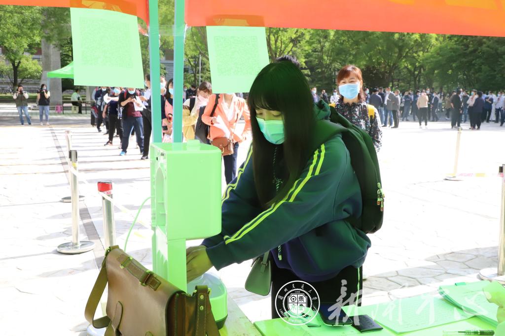 学生检测合格后,按指定路线到达钟楼广场报道。每个学院报到点均设置出入口专用通道并设有醒目标识,配备酒精、感应式消毒器、体温计等防疫物资,辅导员再次核实学生信息后,发放健康手册和校园健康通行证,完成报到注册。