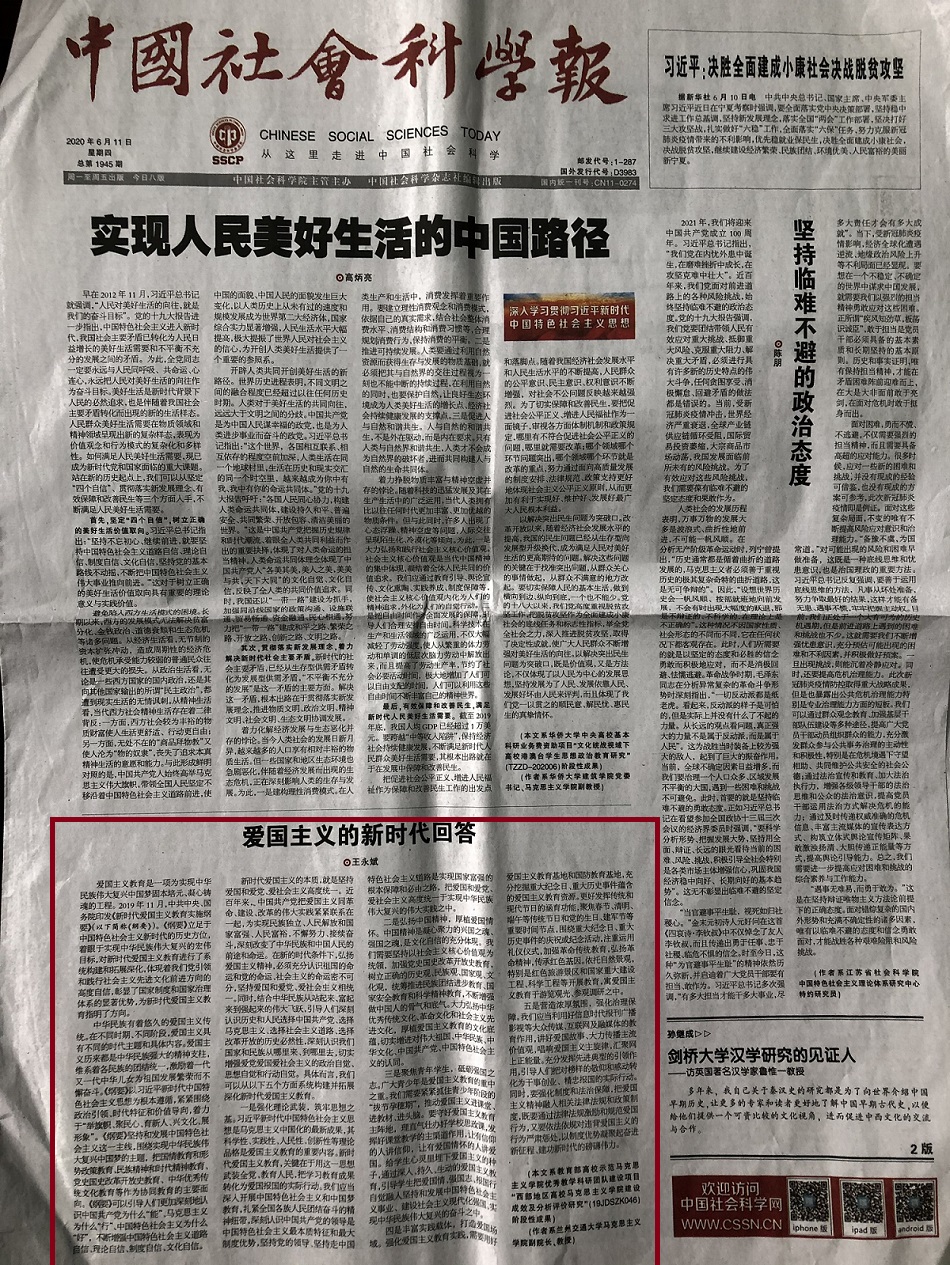 6月11日出版的《中国社会科学报》第一版刊发了我校马克思主义学院王永斌教授的专题评论《爱国主义的新时代回答》,并被学习强国转载。