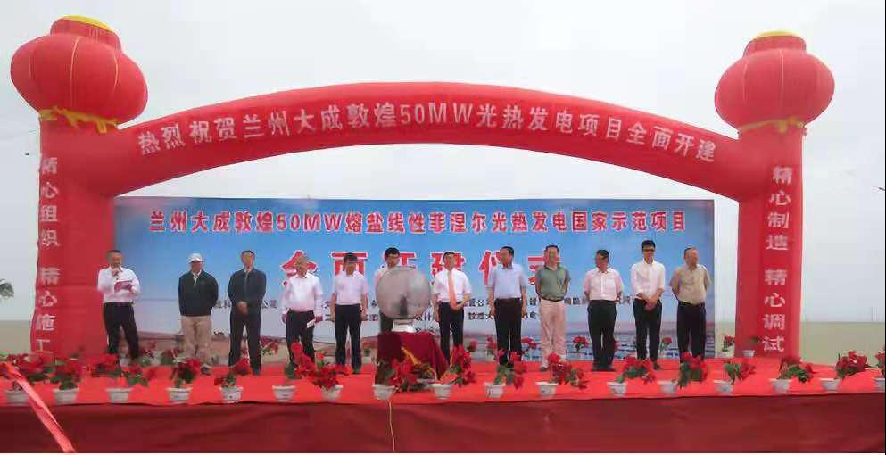 2020年6月19日上午,兰州大成敦煌50MW熔盐线性菲涅尔式光热电站举行投运揭牌仪式,这标志着由兰州大成科技股份有限公司投资建设的世界第一座商业化熔盐线性菲涅尔式光热发电项目正式投入商业运行。