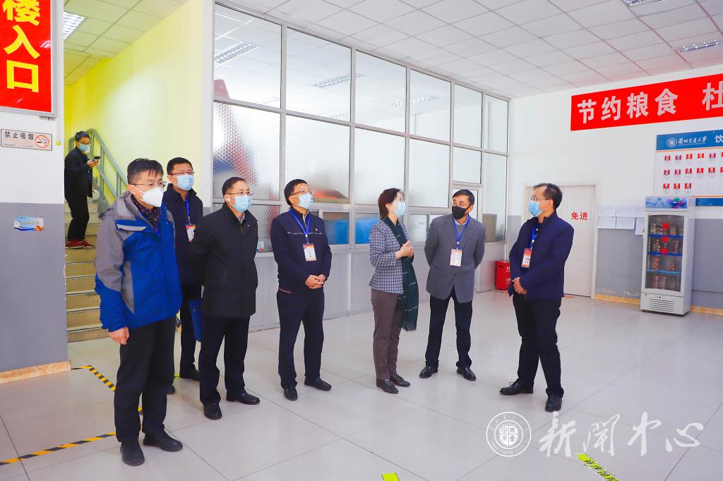 王海燕一行先后前往学校集中留观点育苑宾馆、学生公寓、学生食堂等重点区域,实地查看校门管控、公寓防疫、学生就餐、餐厅防疫等重点区域,并听取相关工作汇报。