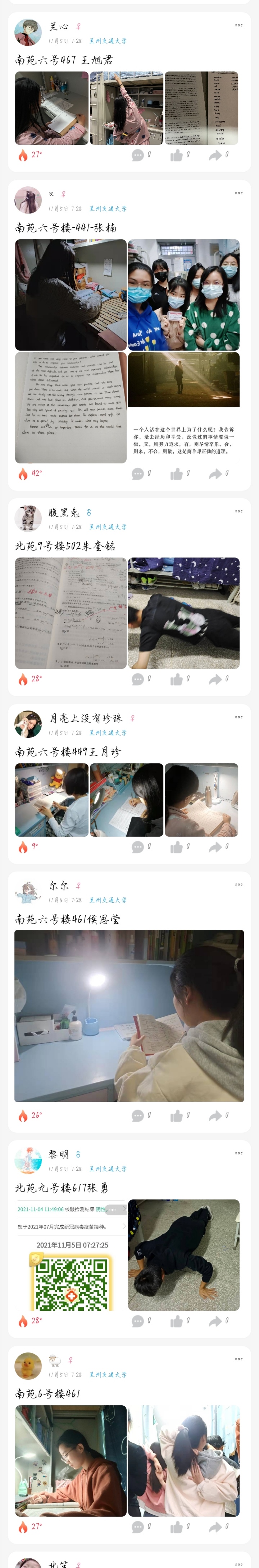 同学们纷纷表示,通过打卡活动,督促自己养成规律的作息习惯,疫情防控期间宿舍封闭管理,并没有让他们的生活黯淡无光,相反,要为生活添上一抹色彩,自觉自律,为战胜疫情做好力所能及的事情!
