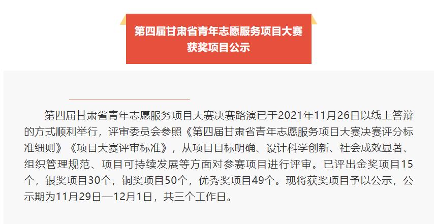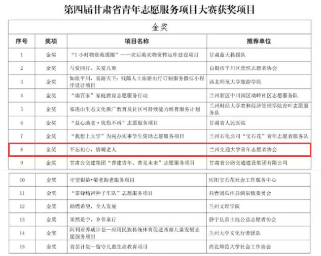 近日,由团省委、省文明办、省民政厅、省生态环境厅、省水利厅、省文化厅和旅游厅等九家单位联合主办的第四届甘肃省青年志愿服务项目大赛在兰州文理学院落幕。本次大赛以“志愿新时代 共筑中国梦”为主题,我校选送的7项青年志愿服务项目表现优秀,获金奖1项、铜奖3项,优秀奖3项。