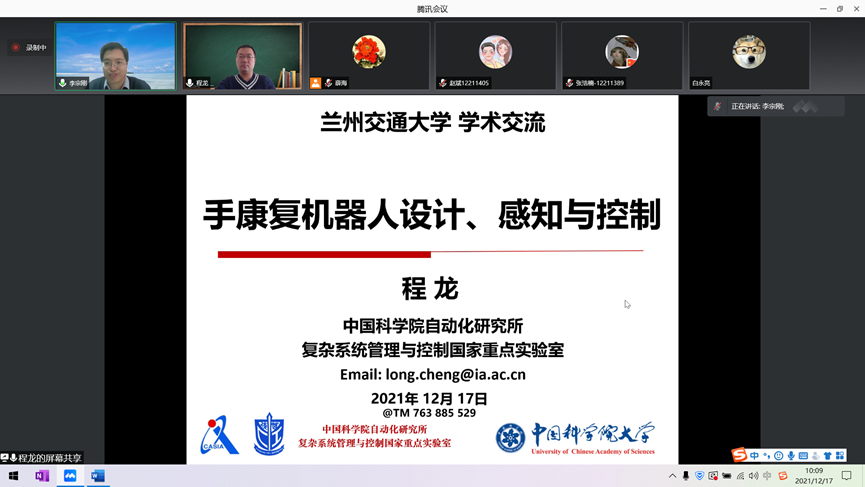 12月17日,程龙研究员作了题为《手康复机器人设计、感知与控制》的学术报告,程龙的报告从康复机器人的研究背景、人机相融的手康复机器人机构设计、柔性传感器设计与制备、手康复机器人的阻抗控制以及临床验证等方面进行了深入交流,阐释了“放心用、安心治、舒心戴”的科研理念。