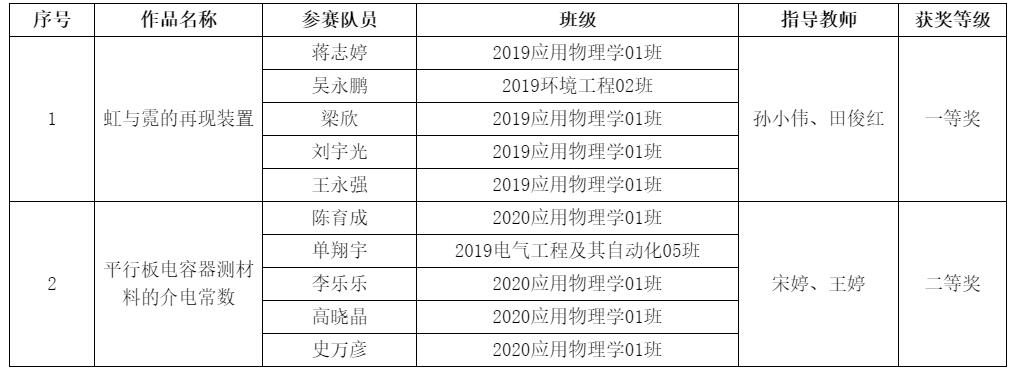 我校赛事从今年5月份启动,全校共有来自10个学院的150名同学报名参赛。物理省级实验教学示范中心于5月30日组织举行校内选拔赛,共遴选出21名优秀同学代表学校参加2021年全国大学生物理实验竞赛(创新),其中孙小伟、田俊红两位老师指导的“虹与霓的再现装置”获得一等奖,宋婷和王婷两位老师指导的“平行板电容器测材料的介电常数”获得二等奖,另外三组参赛作品“自制霍尔效应传感器与螺线管并测量其磁场”、“水/电能量转换及回收利用”和“霍尔效应测磁场”同获优秀奖。
