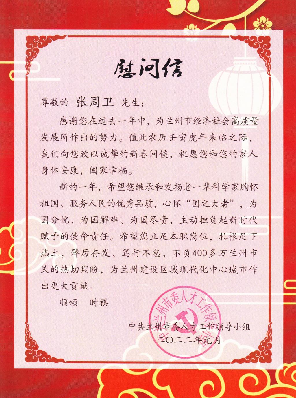 慰问期间,成少平详细询问了张周卫教授个人生活情况、家庭情况,及目前的科研项目开展情况及产业化转化推进情况。他表示,市委市政府高度重视人才工作,要为人才的全面发展及创新创业提供必要的物质条件保障,“着力建设吸引集聚人才平台,充分发挥兰州高层次人才富集的比较优势,依托在兰高校、科研院所特色学科和优质资源,为重振兰州辉煌,广泛吸引并凝聚各类人才”,为兰州的经济社会事业全面发展提供人才保障;将“驰而不息,久久为功”,“下大气力全方位培养、引进、用好人才,努力为系统推进兰州实现高质量发展而提供人才支撑。”过去的一年是实施“十四五”规划的开局之年,是中国共产党成立100周年,是全面开启我市建设现代化中心城市的关键一年。同时,也是我市新冠疫情肆虐、全面防疫的一年。广大市民团结一心,“全城动员、全民参与,联防联控、群防群治”,有效遏制了疫情的蔓延,取得了疫情有效防控与经济持续增长,“步履坚实、收获满满”,这其中也包含着广大教育工作者的坚强支持与默默奉献。再次,成少平转达了市委市政府对辛勤耕耘在科研与教育战线上的广大科教人员的衷心感谢和新年的诚挚祝福。同时希望广大科研人员再接再劢,加强科研成果转化,为我市的经济和科教事业的高质量发展贡献自己的力量。
