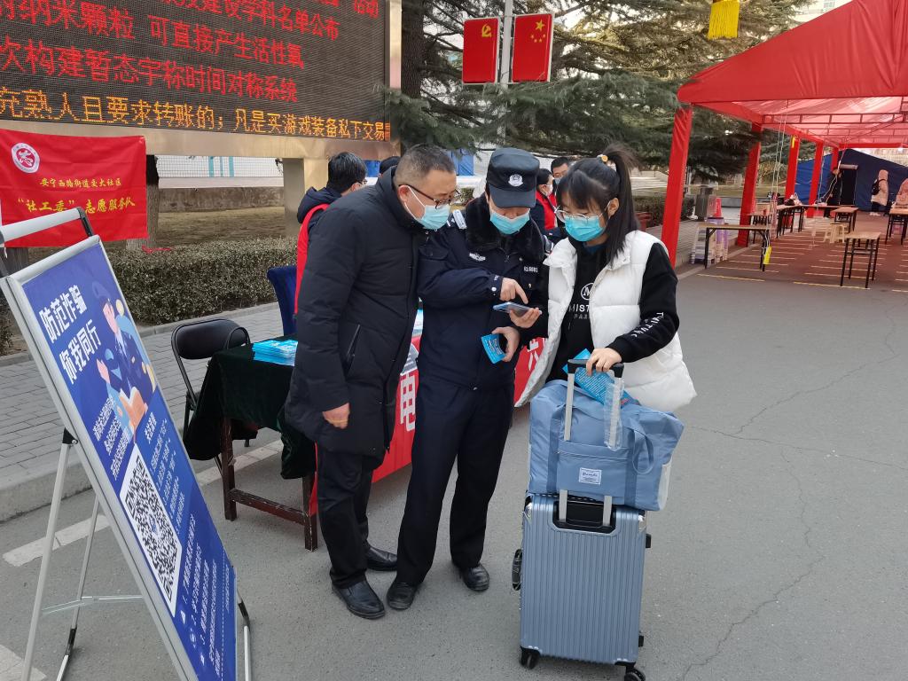 活动现场,保卫处工作人员、派出所民警、社区干部向返校报到的学生集中发放了防电诈宣传彩页和反邪教、禁毒、防火宣传品,现场向同学们讲解了常见电诈类型与防范措施。公安民警还就“终结诈骗”(金钟罩)小程序的注册关注及“国家反诈中心”APP的下载安装向同学们做了演示讲解。