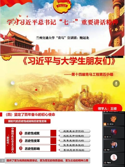 开展领学活动“长才干”。“青马”学员们以小组为单位,邀请我校“青马”宣讲团成员进行领学,校级“青马”宣讲团成员围绕党的十九届六中全会精神、习近平新时代中国特色社会主义思想等内容,运用PPT、音视频动画等多媒体形式,以线上会议的方式累计为学员们开展了12次重点突出、入脑入心的领学活动,教育引导学员们努力把党史“必修课”学深悟透,厚植爱党、爱国、爱社会主义的情感,以坚韧不拔的意志力追赶超越,以爱党爱国的实际行动继承发扬,铸就兰州交大“青马人”的硬核品牌。