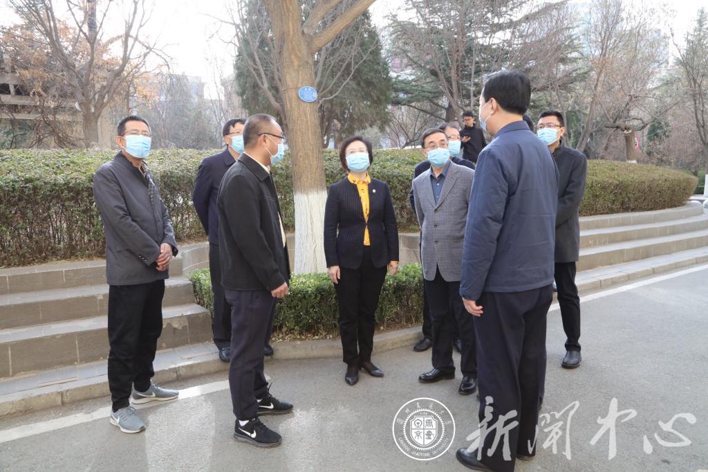 王海燕一行先后前往学生公寓、学生食堂、附属中学、附属小学等重点区域,实地查看了解校门管控、公寓防疫、餐厅防疫、校园管理等防疫措施落实情况,并听取相关工作汇报。