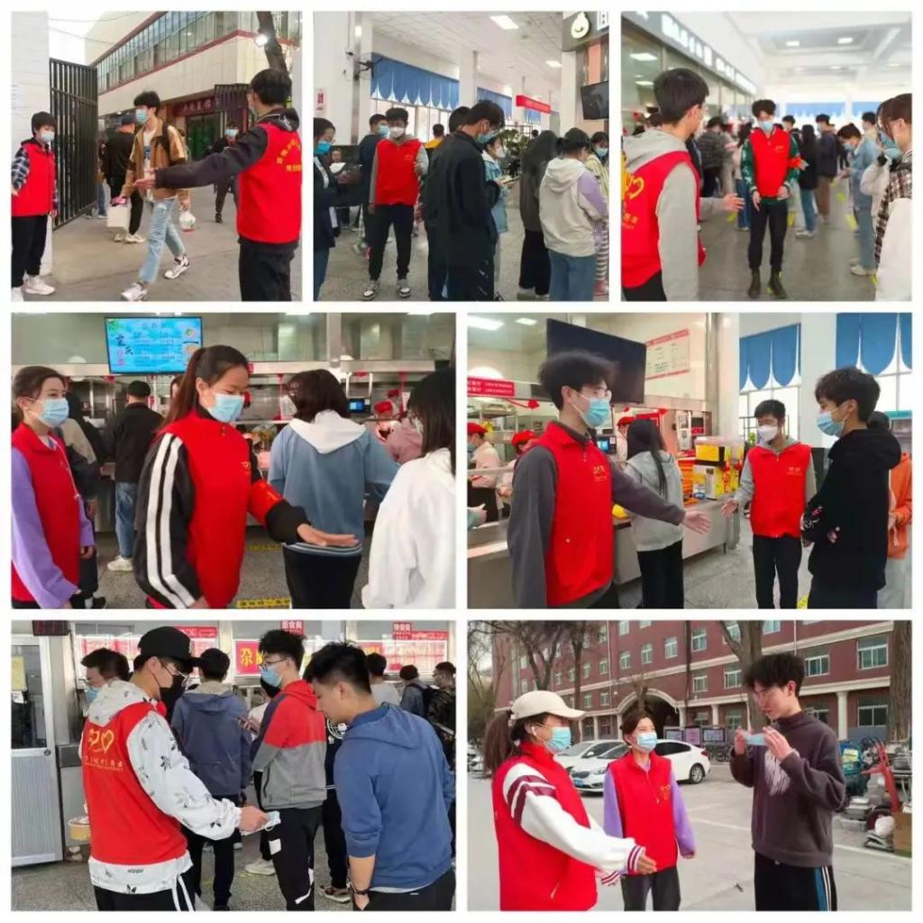 由校学生会、学生社团管理部、校青年志愿者协会、大学生艺术团四个校级组织的骨干学生干部组成的“疫情防控青年劝导队”迅速完成集结,分别在朝阳餐厅、学生餐厅、百苑餐厅三个人流密集片区,开展劝导佩戴口罩、劝导间隔排队、劝导单向就坐、劝导减少堂食、劝导杜绝不文明行为等疫情防控劝导工作。根据用餐人流高峰时段,劝导队分早中晚三个时段,采用流动劝导和定点劝导相结合方式,开展了行之有效的疫情防控劝导,同时也会向有需要的同学提供力所能及的帮助及服务。