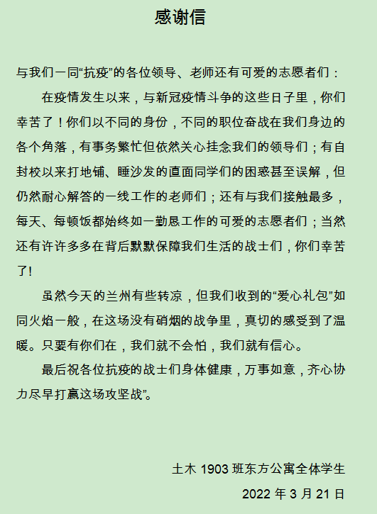 3月21日,学校为居住在校外东方公寓、桃海公寓的学生送去“爱心礼包”,共发放1280箱牛奶,送去温馨关爱。住在桃海公寓的自动化学院赵玉龙同学感动道:天寒心不寒,病毒无情人有情。感谢学校领导、老师的关心和爱护。同心抗疫,交大必胜,兰州加油!住在东方公寓的土木学院1903班全体学生发来感谢信,感谢在这场抗疫战斗中带给他们温暖和信心的学校领导、辅导员老师、志愿者同学。