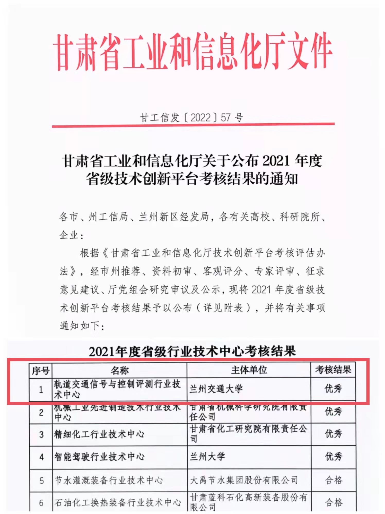 近日,甘肃省工业和信息化厅公布了2021年度省级技术创新平台考核结果,依托兰州交通大学研究院自动控制研究所建设的轨道交通信号与控制评测行业技术中心获评优秀。