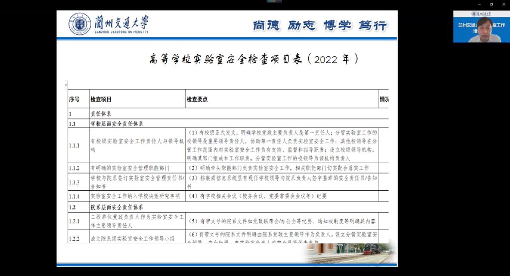 实验管理中心负责人结合教育部《关于组织开展2022年高等学校实验室安全检查工作的通知》和教育部实验室安全现场检查启动会的相关情况和要求,解读了2022版高等学校实验室安全检查项目,深入学习了《兰州交通大学实验室安全工作管理办法》等系列安全文件,并通报了以往学校实验室安全检查发现的问题,分享了“三个面向、七个分级”的实验室安全管理方法,强调各学院、中心、科研实验室务必高度重视实验室安全,完善规章制度,压实安全责任,抓好检查落实,及时消除隐患,做好实验室安全检查迎检工作。希望各单位借助此次培训机会,认真学习实验室建设、维修和安全管理等方面的文件和知识,共同促进和提升我校实验室工作水平。