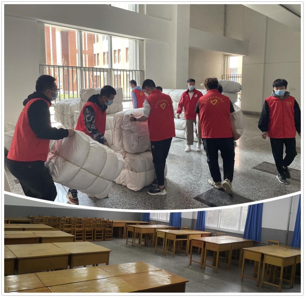 为了确保南苑和北苑学生管控区的安全,3月17日,后勤保障部统一部署,安排饮食服务中心489名校外从业人员及其他部分后勤服务人员分区留校居住。公共用房中心接到此项任务后,连夜对第五教学楼、第九教学楼进行实地摸排核实,在确保不影响广大同学线上学习和自习的情况下,从这两栋教学楼调整出58间教室作为校外从业人员的临时居住用房。18日上午,在学生志愿者的帮助下,完成3192张课桌摆放,铺设床位532张,并进行专用通道设置、警示张贴及清洁消杀等工作,于下午5时30分完成分区留住人员床位分配任务,彻底解决了校内从业人员的住宿难题。