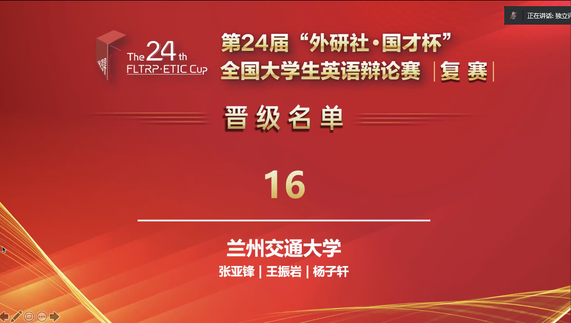 唇枪舌战话发展,针锋相对绽才思。4月16至17日,第24届“外研社·国才杯”全国大学生英语辩论赛华西地区总决赛在互联网云端落下帷幕。我校英语创新教育教学团队张亚锋和强臻老师带领外国语学院2019级英语专业学生杨子轩和2020级英语专业学生王振岩,经过两天五轮的循环赛以大区排名16的好成绩成功晋级全国总决赛,成为甘肃省唯一晋级全国总结赛的队伍,并最终获得华西区总决赛一等奖。强臻老师此次也受邀担任地区赛副总裁判长。