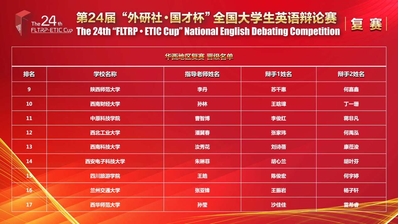 在此次华西地区总决赛中,来自陕西省、山西省、重庆市、四川省、河南省、甘肃省等十一个省、市自治区的91支高校代表队182位参赛选手在循环赛中强强相遇尽显风采。同时为了确保比赛的公平性,大赛采用双机位线上模式。本次大赛辩题思民所思、虑民所虑,竞技切磋的同时发人深省,育人铸魂润物而无声,为青年成长提供有效引导。华西地区复赛辩题聚焦辩手思考生态环境保护和经济繁荣发展之间的关系,帮助辩手深刻认识疫情时代人类命运共同体的构建,而且以杜牧《题乌江亭》作为辩题背景引导辩手进行以古鉴今的哲学思考,帮助辩手从多元的文化视角深刻理解中国文化与民族精神。大赛不仅考查其英语运用能力,更深入发掘其知识储备、研究论证能力和思辨能力,引导其拓展思维、理论联系实际,学以致用。