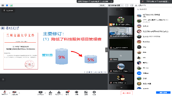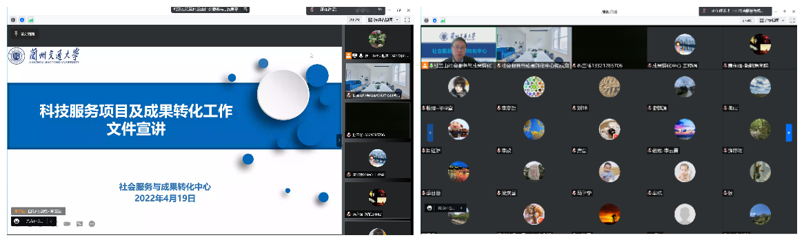 为进一步贯彻落实国家和甘肃省关于科技创新和成果转化的战略部署,推动我校科技成果转化工作,提升科研人员对相关政策的认识,及成果转化意识,同时配合全国知识产权宣传周活动,4月19日下午,社会服务与成果转化中心举办了科技服务与成果转化政策线上宣讲会。各教学科研单位分管科研工作的负责人、科研办主任,承担科技服务项目、科技成果转化项目的负责人、社会服务与科技成果转化中心全体工作人员及相关业务部门的人员,共计140人参加了宣讲会。