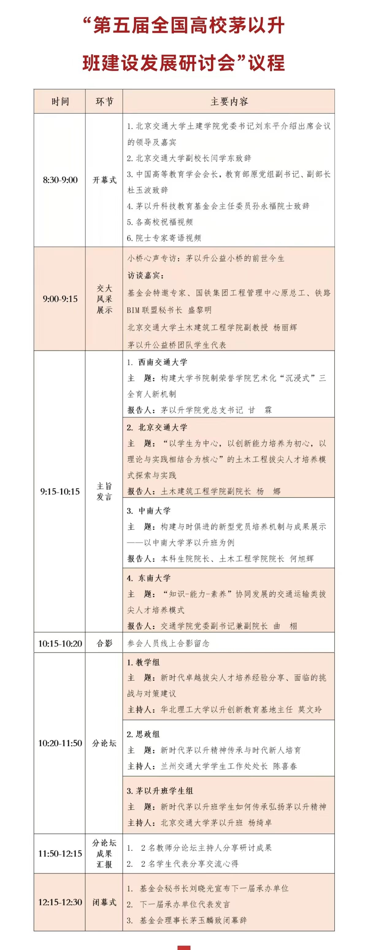 中国高等教育学会会长,教育部原党组副书记、副部长杜玉波,茅以升科技教育基金会主任委员孙永福院士,北京交通大学副校长闫学东教授,北京茅以升科技教育基金会秘书长茅玉麟女士,以及来自西南交通大学、北京交通大学、哈尔滨工业大学、天津大学、中南大学、东南大学等15所兄弟高校主管“茅以升班”的负责人参会。我校土木工程学院、学生工作部负责人应邀参加会议。