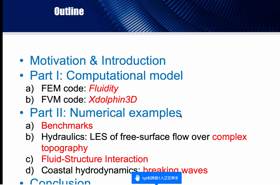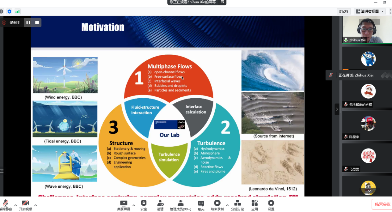 谢志华系统介绍了目前国际上主要的计算流体力学数值方法及模型,包括流动性的有限元程序及FVM代码,并讲解了如何应用这些程序及代码去研究多相流中的明渠流、界面波、气泡、液滴、自由表面流以及颗粒和沉积物等,同时,针对流体力学中重要且复杂的湍流问题,包括复杂地形上自由表面流动的大涡模拟、反应性流动、流体-结构相互作用以及火灾和羽流等为大家进行了详细的讲解,最后分享了流体力学在海岸破碎波、水利及海洋工程中的代表性应用案例。